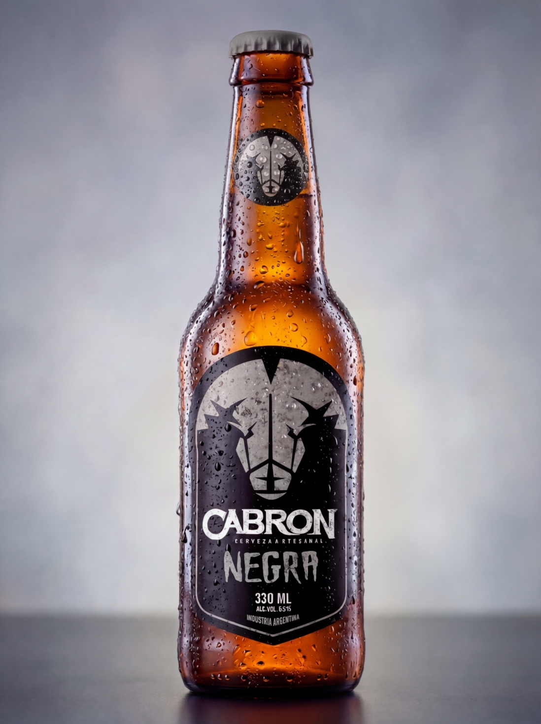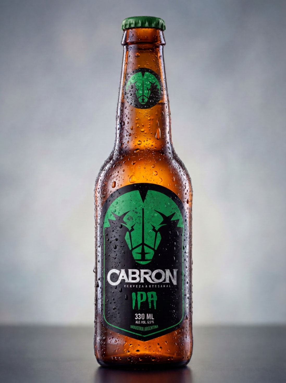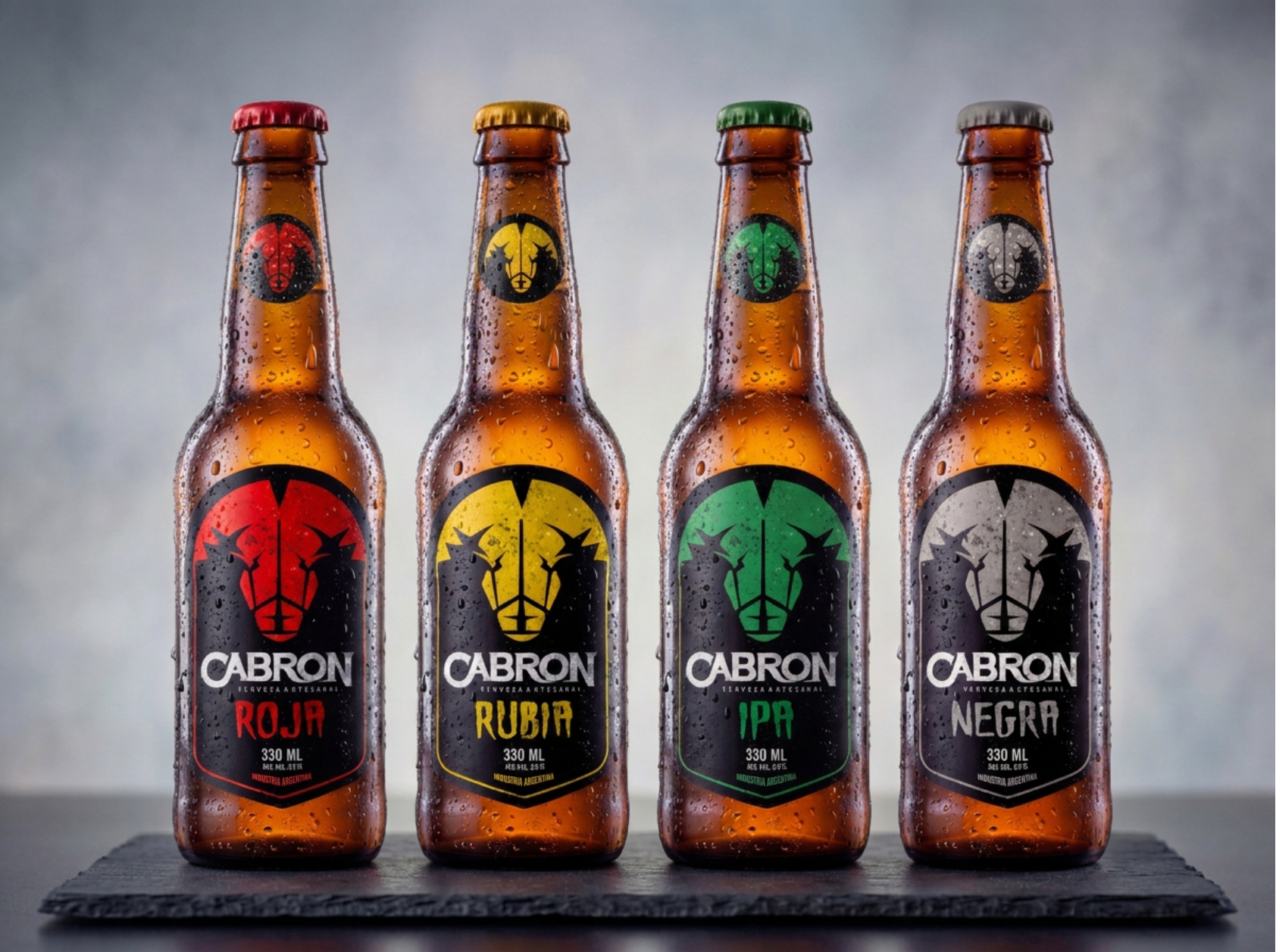 El sistema se adapta con solidez a las etiquetas del producto, donde la combinación de símbolo, color y tipografía permite diferenciar cada variedad sin perder coherencia visual. Así, CABRÓN construye una marca reconocible, versátil y con una impronta fuerte dentro del universo de la cerveza artesanal.